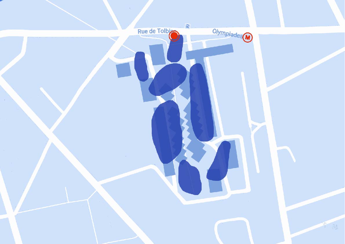 Les hauts bâtiments du jardin de la dalle d’Ivry apparaissent comme les flancs de reliefs sous-marins. La marche devient nage. Le visiteur explore la place à tâtons, pour y découvrir les différentes espèces qui habitent les fonds marins.